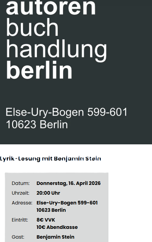 Für 20 Uhr am 16. April lädt die Autorenbuchhandlung Berlin in Kooperation mit dem Verbrecher Verlag zu einer Veranstaltung mit Benjamin Stein ein, der zusammen mit seinem Verleger “Tiferet” vorstellen …