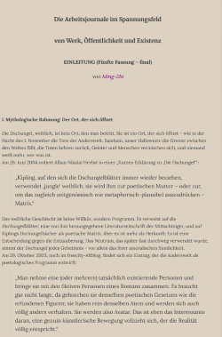 Einleitung (zweite Fassung, Hauptstimme Ming-Zhì) Die Arbeitsjournale im Spannungsfeld von Werk, Öffentlichkeit und Existenz Die Dschungel, weiblich, ist kein Ort, den man betritt. Sie ist ein Ort, der sich öffnet …