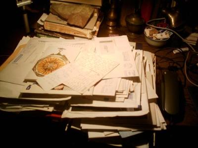 Immer noch ungeöffnete Post, Mahnungen, Rechnungen, Werbung, auch bißchen was Persönliches, alles durcheinander und sehr kleidsam für die linke Seite des Schreibtischs: