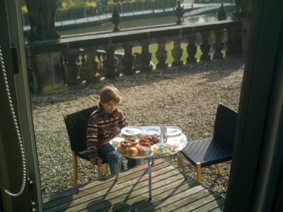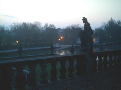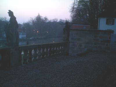 ; zudem ist die gekieste Terrasse nicht breiter als vierfünf Meter und fällt hinter der Brüstung zum Barockgarten ab, hinter dessen Mauer gleich der Fluß strömt.