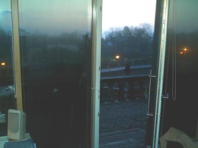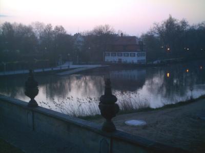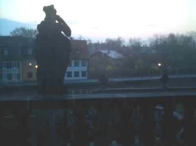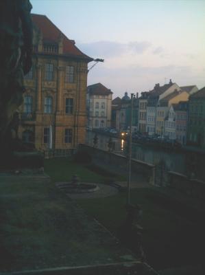 Um zwanzig vor sechs wachgeworden; der Junge schläft fest. In paar Sachen geschlüpft, vor die Fenstertür getreten, Blick auf die barocke Zeile auf der anderen Regnitzseite.