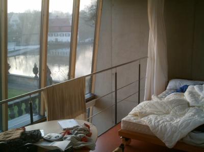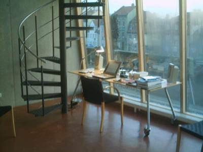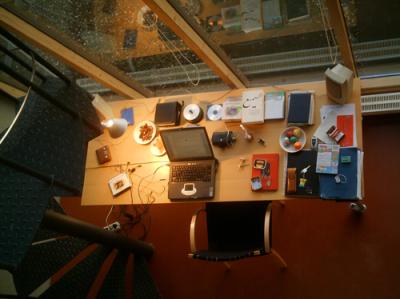 , im oberen Teil des Studios, in das ein zweiter Boden eingelassen ist, der etwa die halbe Grundfläche des Raumes hat; dort oben dann auch der Kleiderschrank. Einen weiteren Tisch gibt es dort direkt vor dem offenen Gelände; das wäre ebenfalls ein wunderbarer Arbeitsplatz, aber er ist mir zu nah am Ruhebereich.