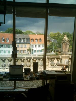 [Villa Concordia Bamberg; die Sonne bricht momentlang durchs schwarzgraue, tiefhängende Gewölk.]