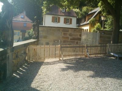 Nun hat man heute früh, selbstverständlich ohne Absprache, einen Jägerzaun gebaut, der den Kunststipendiaten des Freistaates Bayern verwehrt, über die Steintreppe hinab in das Barockgärtchen zu gehen – selbstverständlich nicht d e s h a l b, sondern um wohl die am Sonntag massiv um die Herren Lüpertz & Goldmann sich scharenden Girlies und Boylies davon abzuhalten, sich auch den hier wohnenden Künstlern anzuwerfen mit aufgerissenen Blüs’chen und womöglich offenem Hosenstall. Einmal abgesehen davon, daß, besonders bezüglich der Blüs’chen, dabei gewiß Schöneres ausgestellt würde, als nur eine der Figuren Markus Lüpertz’ es ist – man kommt sich nun wie eingesperrt vor, gleichsam in einem Zoo… und ich s e h schon die goldmann-lüpertzschen Schleppenträger ins Gehege der internierten Kunsttiere gaffen…