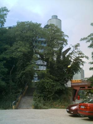 Hier schoß aus der Nebelkammer das Thetismeer und ergoß sich aus den Fenstern des ersten Stockwerks, schon aus sämtlichen berstenden andren auf den Parkplatz.
