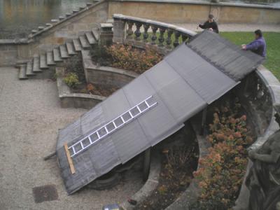Meine Herren, in d i e s e r Aufnahme schlägt Michelangeli aber drein! Dem wäre – in seiner arietten Massivität – als Liebhaber nicht auszuweichen gewesen. Und draußen im Barockgärtchen wird seit anderthalb Stunden der allegorische Brunnen, der leider sowieso kein Wasser spuckte, zugebrettert. Vielleicht um ihn ‚winterfest‘ zu machen.Ich hab mal eben die beiden Arbeiter gefragt. Ja, um ihn vorm Winter zu schützen.