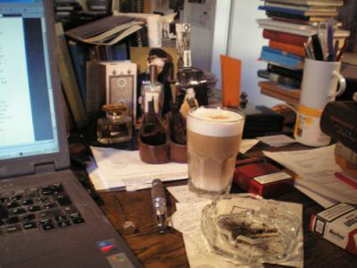 [Berlin. Arbeitswohnung.]Solch ein gutes Gefühl, wieder einmal Zuhause zu sein, am eigenen Schreibtisch, den Blick auf all die Musik, auf die Bücher, die Bilder, Erinnerungen, Schlafcouch, den riesigen Arbeitstisch, an dem sich auch sehr gute Essen geben lassen… ah, ich sag Ihnen! Ich habe mich entschlossen, heute h i e r zu arbeiten, auch wenn ich für den Netzzugang das Mobilchen nehmen muß, was vielleicht ein wenig teuer ist, aber sich seelisch so lohnt. Und soeben – welch vertrautes, vermißtes Geräusch! – zischt die PAVONI, um deutlichst daran zu gemahnen, daß das Espressowasser darauf wartet, durch das Espressopulver gepreßt zu werden…… und jetzt steht er rechts vor mir, hellbraun in Schichten, der vertraute latte macchiato, eine Pfeife, mal wieder, ist gestopft und der Tabak entzündet… und es geht weiter an THETIS. Leider kann ich keine Musik hören, wenn ich überarbeite. Aber ich werde später eine der VARIATIONEN FÜR GITARRE UND SPRACHE von 1982 in den Laptop einspielen und für den nächsten Newsletter als m3 formatieren. Regine Hoch-Shekov und ich hatten seinerzeit ein abendfüllendes Programm, dessen eine Aufführung mitgeschnitten worden ist. Jedenfalls will ich heute h i e r arbeiten, bis mein Junge abends abzuholen ist, und hier auch werden Sonntag/Montag erstmals die Bamberger Elegien lektoriert werden; es ist wie eine Wiedereinnahme von Heimat und wie eine sanfte Formklammer: als wäre ich von einer weiten Reise mit viel Arbeitsmaterial zurückgekehrt, das nun gesichtet, befühlt und gefeilt und in die erste haltende Form gebracht werden muß.