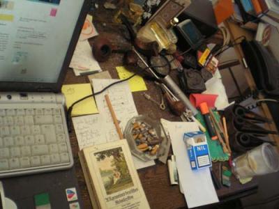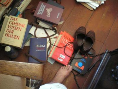 Seit halb sieben an >>>> AEOLIA. Gestern nacht, mit dem Profi, wurde es spät. So verschieben sich momentan die Arbeitszeiten ins Unstete. Aber ich bin so tief in dem Text, daß das gar nichts ausmacht. Und auch die Wut und die Niedergeschlagenheit, auch die Angst, wegen der ökonomischen Situation bremst die Produktionskraft allenfalls mal für einzwei Stunden, dann schüttelt sich das ab, und ich arbeite in kräftigen Schüben weiter. Dabei vermoddert der Schreibtisch zusehens, verdreckt, wird unübersichtlich wie der Fußboden, den um den Arbeitplatz die übereinandergestapelten Lexika zudecken. Aber das ist immer so: Bin ich in einer Arbeit, wühlt sich die anfangs herrschende Ordnung völlig zu und wird erst wieder hergestellt, ist die Arbeit, jedenfalls ein Arbeitsgang, beendet.