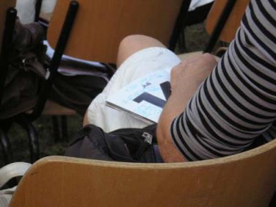 Danach eine vorzügliche Moderation Maxim Billers; es ist vergnüglich anzusehen, mit welcher Leidenschaft er sich einlassen möchte, aber ja nicht darf, weil seine Rolle am Nachmittag eben die eines Moderators ist, wie geschickt er es dann aber versteht, dennoch seine Positionen laut werden zu lassen, die ich zwar nicht unbedingt teile (etwa, wenn er den Kapitalismus als das beste aller poltisch/ökonomischen Modelle preist), die aber durch seine Leidenschaftlichkeit nachvollziehbar werden. Ich bekam direkt Lust, mich mit ihm zu streiten, aber ich war ja nur Zuhörer an diesem Nachmittag.Die gesamte Augsburger Stadt war heute von Hochzeitspaaren in Schwarzweiß geflutet, teils, dachte ich, sind ihnen je vier Pferde vorgespannt… eine unlautere Zusammenziehung, ich weiß. Als wir so vorm Capitol zusammensaßen, Andreas Neumeister, Krausser auch schon, glaube ich, die Buschheuer und weitere, schreitet eine hochgewachsene, mulattenhäutige Frau auf eine derart märchenhaft-lockende Weise vorbei, daß ich die ersten Verse eines Gedichtes skizziere.Was die Frau so locken läßt, ist ein Tattoo, das sie von der linken Schulter abwärts zum Ellenbogen trägt… austrägt, inszeniert… und sie hat ja ganz recht, es ist eine enorm feine arabeske Arbeit, an die sich sinnliche Augen heften m ü s s e n, es bleibt ihnen rein keine andere Wahl…