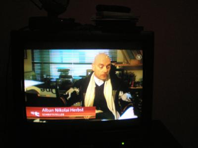 Pünktlich hoch, mein Zeug zusammengesucht und durch die Kälte hergeradelt. Ich will erst noch mal an die Zehnte Scelsi-Variation, bevor ich die Kritik zur Kinderoper schreibe. Fremd, immer wieder fremd, sich selbst im Fernsehen zu sehen……zumal das Team zwar das endgültige Cover der MEERE-Lizenzausgabe bei >>>> dielmann zu sehen bekam, die ab dem 9. November ausgeliefert wird, für die Sendung aber dennoch das von mir gekippte, gar nicht mehr gültige Entwurfscover ins Bild genommen hat. No jo, würde >>>> Buschheuer sagen. Danach noch (nein, nicht nachdem sie das gesagt hat, sondern nach der Sendung) Telefonate mit dem Profi, mit U. und mit UF, der folgendes dazukommentierte: „Mein Chef sagt auch immer: die Recherche macht einem die schönste Story kaputt“, was bedeutet, daß mein bedenklicher Einwand, nun ja, es hätten immerhin zwei Grundrechte einander gegenübergestanden, dem Schnitt zum Opfer fiel; ich denke mir, auch die Kollegen werden nicht so eindeutig reagiert haben, wie das in dem Filmchen herüberkam; daß meine Einlassung, existentielle Bedrohung könne durchaus auch eine Grundbedingung künstlerischen Schaffens sein – um es anzuheizen, um ihm den Wert zu geben usw. -, fand dann logischerweise g a r keinen Raum mehr. Egal. Wenn für den Beitrag auch zu den anderen Autoren immer eigens gereist worden ist, haben die 7 Minuten wahrscheinlich mehr als 10.000 Euro gekostet; U. allerdings wandte ein, sie habe den Beitrag insofern okay gefunden, als er auf sehr einfache Weise für eine Problemlage sensibilisiere, die im allgemeinen Bewußtsein noch gar nicht angekommen sei. Das stimmt möglicherweise, könnte aber auch übersehen, daß ohnedies nur Sensibilisierte das Publikum für ttt sind; d a n n wäre der Beitrag entschieden zu simpel.