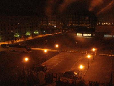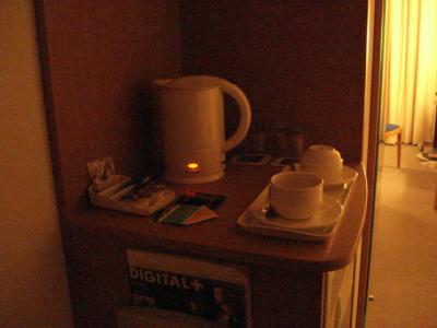 [Valladolid, >>>> Novotel.]Das wiederum ist wirklicher Service, namentlich, wenn man Morgenarbeiter ist: im Eckchen stehn auf der Hausbar Tütchen gefriergetrockneten Kaffees und Tee, sowie Tassen und ein Erhitzer bereit; nur Zucker fehlt; seltsam, für Spanien. Und man kann nicht von „schöner Aussicht“ sprechen,aber ich guck ja eh nur in das Gerät.]