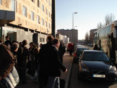 Meine Idee, übrigens, durch die Hotelgänge zu spazieren, um Musiker aufzunehmen, die hinter ihren Türen proben, dürfte nicht umzusetzen sein. Einige Musiker sind nach Salamanca gefahren, um sich die Stadt anzusehen. „Die Bläser k ö n n e n üben“, sagt ein Cellist, „ich kann es nicht. Mein Instrument ist nämlich noch gar nicht da.“ Wie ich’s gestern erzählte: die großen Instrumente flogen nicht mit, sondern werden von Deutschland mit einer Spedition hergefahren.