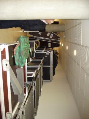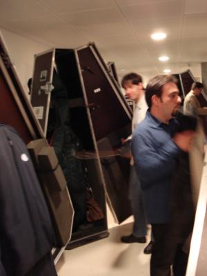 Betroffenheit aber, weil der Saal nicht voll ist, auch wenn man’s zu überspielen versucht; so etwas schmerzt, ich weiß sehr gut, wovon ich schreibe.Nun sind sie alle auseinandergezogen – oder miteinander, in die Stadt, um noch ein Bier zu trinken. Ich wäre gern dabeigewesen, aber muß(te) schreiben. Doch nun ist’s nach zwölf. Ich will morgen früh um 4.30 Uhr hoch, auch unterwegs darf Disziplin niemals schleifen; man hat schließlich einen Künstlerberuf. Und ich will noch ein paar Bilder hierzustellen, damit Sie einen Eindruck haben. Und von denen zweidrei ganz bestimmt zum Schluß, weil das etwas so Komisches hat: mit den Instrumenten sind nämlich auch die Abendgarderoben der Musiker angekommen, und allesie warn dabei, nach ihren Kleidern zu suchen.