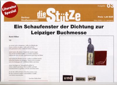 Ein sehr schönes Projekt hat zur Leipziger Buchmesse das >>>> Literaturhaus Berlin realisiert, nämlich eine Ausgabe der Berliner Obdachlosenzeitung >>>> DIE STÜTZE gestaltet.