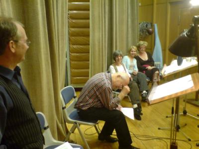 Die Schauspieler kennen einander, haben manchen Topf zusammen aus den Bretterfeuern geholt, das hilft. Schnell ist man sowieso, auch unter Unbekannten, per Du; ich halte auf Distanz, sehr freundlich, sehr verbindlich, so fühle ich auch, aber per Sie. Und tatsächlich läuft das Stück ganz wunderbar, ich muß selten trietzen, lasse die Sprecher ganz zu Anfang in die Musik hineinhören, damit sie einen Eindruck haben, damit ihr Stimmduktus ihn aufnimmt.