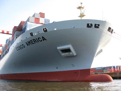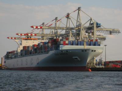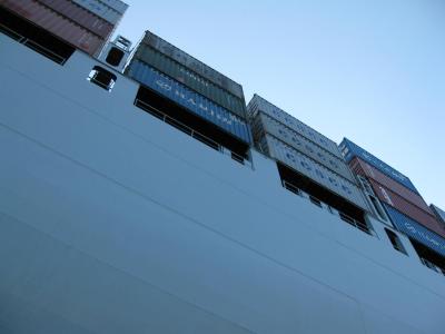ich habe das große glück, dass meine freundin einmal bei einer werft gearbeitet hat, so werde ich in kürze in genuss kommen, mir ansehen zu können, wie ein riesengroßes containerschiff gebaut wird. ich weiß jetzt schon, dass ich die augen nicht wieder zukriegen werde. auf der hafenrundfahrt sind wir an mehreren containerriesen vorbeigefahren, an eines ist der kapitän unserer kleinen barkasse ganz dicht herangefahren.