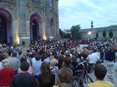 Abends gestern spielte das >>>> Lietze-Orchester im Rahmen der >>>> Monbijout-Festspiele, die der Gründer des Strandbades Mitte initiiert hat und koordiniert, vorm Bodemuseum Sibelius und Schumann. Ich traf den Profi dort auf ein kurzes, aber das Orchester spielte so saumiserabel, und vor allem war der Klang, als ob es in einem nassen Pappkarton gesessen hätte, daß ich das nicht durchhielt und wieder ging. Schön aussehen tat’s aber.