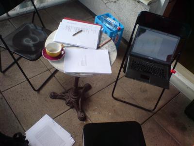 Nun aber an die Mail. Guten Morgen. Neben meinem Laptop auf C’s Schreibtisch steht eine französische Tasse Kaffees.