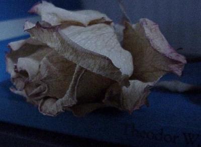 viele tage schaute ich jeden abend im november letztes jahr nach ihr, fragte mich, ob sie es schaffen würde, vor dem winter zu blühen. den letzten abend ihrer blüte sah ich sie, aber wie bei der frucht, bei der der endstand immer der, der perfekten frucht ist, hatte auch sie an diesem abend ihr endstadium erreicht. am nächsten tag fand ich sie abgeknickt an ihrem ästchen hängend, nahm sie vorsichtig ab. in der folgenden nacht gab es den ersten richtigen frost. die anderen noch blühen wollenden knospen erfroren, und das leben in ihnen mit. ich trocknete sie. seit damals liegt sie auf einem buch auf meinem schreibtisch. ihr duft hat sich zwar verändert, aber intensiviert. ein ruhiger grund von moos und erde, der einen anteil von zitrone, orange… und nelke in sich trägt. darüber liegt ein schweben von honig und himbeeren. in ihrer blüte trugen ihre leuchtend gelben blätter einen magentafarbenen rand. die aufnahme ist nicht sehr gut geworden, ich finde sie trotzdem wunderschön. als ich auf den auslöser drückte, fiel das kalte licht der mondin durch das fenster auf sie. so trägt sie doch noch den winter, der nach ihrer blüte kam.