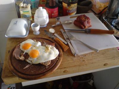 So ich brate mir zwei Spiegeleier und futter sie mit Scheiben Schinkenspecks auf Brot. Sò.