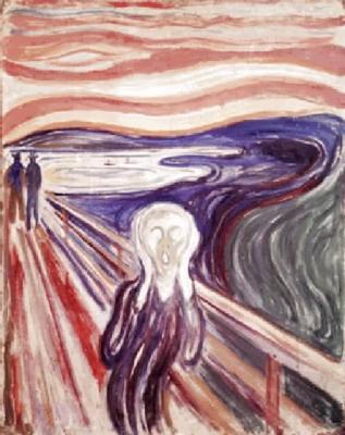 >>>Peter Schlehmils Schatten, an den Mann in Grau verkauft, Chamisso berichtet vom Teufel noch direkt, mutiert in >>>>„Mattia Pascal“ zu einer Nichtexistenz mit Namen Adriano Meis, der durch die Liebe auch noch ihr „Nicht“ abhanden kommt. Steckt doch bei Pirandello der Teufel, ebenso wie bei Paul, in den vertrackten Umständen, die erst dann zutage treten, wenn unvorhergesehen ihr pantomimischer Schatten selbständiges Subjekt zu werden droht, indem sie Signale an das längst verstummte Gedächtnis funken. Beide, der Mann ohne Schatten und der Schatten ohne Mann, verdammt zu Landstreicherei (Pirandello: vagabondaggio), halten sich, und schon wieder kommt Munch ins Spiel, die Ohren zu. Der eine mit märchenhaften Aussichten, der andere, außerhalb des Grabes, ganz ohne Perspektive.