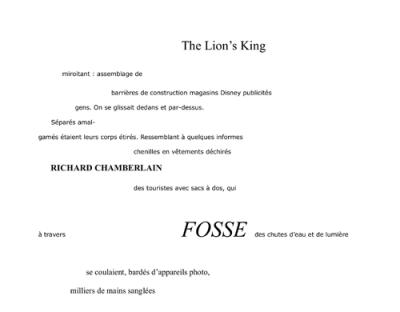 Mantler joue crescendo : du fond de l’inaudible, long solo qui vient se nicher doucement à l’intérieur ; le silence fut tel qu’on entendit le passage d’une rame de métro dans le ciel, et des vibrations résonnèrent dans les accoudoirs ; les portes débordaient de gens, mais des reporters étaient parvenus à se glisser à l’intérieur et de temps en temps un flash crépitait dans la salle. On raconta plus tard que des unités de police auraient réussi à se frayer un chemin à force de coups, mais la foule avait stoppé leur avance et pour passer dans les couloirs bondés elles auraient dû abattre des gens. Mais les policiers n’avaient pas reçu d’instructions en ce sens, et même s’ils en avaient eu, personne ne les aurait suivies. De nombreux cops d’ailleurs refusèrent d’aller plus loin. Guiliani, prévenu en catastrophe, avait hurlé de rage, braillant ici et là dans tous les sens à downtown City Hall dans la governor’s room. Ah, quel dommage qu’il n’ait pas entendu le concert ! Et Martha ? Que faisait-elle pendant ce temps-là ? Elle était assise dans le showroom derrière le public et observait avec ennui le strip-tease d’une nouvelle, assez douée, en fait, la petite ; est-ce qu’elle savait aussi bien manier le revolver ? Pendant ce temps, Mr.Thimble accoudé dans un bar se donnait du courage pour plus tard à coups de manhattans; il ne pouvait pas imaginer que sa Lissy… d’autant que sa destinée allait recevoir le coup de grâce cette nuit même, mauvais, mauvais, qui a dit que la vie était juste ? sinon je n’aurais pas pu ronfler dans mon coin dans mon STAR HOTEL auquel on avait ôté le toit. J’avais du mal à dormir vraiment car le coffre-fort s’ouvrait et se fermait sans arrêt. Je voyais se déverser des flots ininterrompus à l’intérieur de mon sommeil et l’eau de nouveau dévalait les marches entre le deuxième étage et le premier et dégoulinait dans le couloir pour atteindre le rez-de-chaussée, cascadant toujours plus vite dans l’escalier et s’entassant contre les joints de la porte qui donnait sur la rue, l’eau coulait comme du sang, cette maison du numéro 300 de la 30th St. ouest. Sur ma table de chevet le réveil allait vers vingt-trois heures tandis que traversant Times Square dans la pluie qui tombait à verse des skaters inline filaient