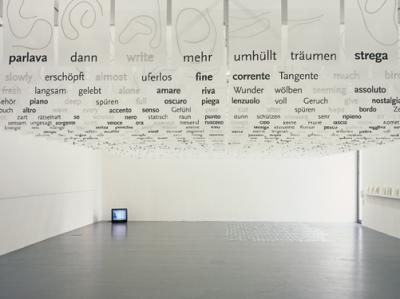 verschiedenen Sprachen ist Zentrum der Ausstellung. Dieses individuell anberaumte Lexikon, in dem ein sich permanent windender (usus statt Ariadne)Faden die mäandrierende Fließbewegung des Übertragens der Bedeutungen vom einen in den anderen Sprachvorrat signalisiert, versteht sich wie das Mündungsdelta einer Lebensführung, die permanent in Bewegung ist.