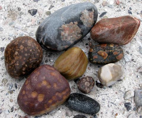 …. die, die wie ein stück blutwurst aussehen, sind porphyre, das stück rindfleisch ist feldspat. der verkieselte rechts unten im bild entpuppt sich tatsächlich als eine verkieselung von etwas, darunter ist ein anderes gestein. die orangefarbenen augen in dem dunklen biotit… das ist ein augengneis, den links unten im bild (orange, weinrot bis lila) halte ich für roten kalkstein, muß da aber noch weiter forschen. den schwarzen ganz unten kann ich noch garnicht zuordnen, ganz oben das dunkle gestein zähle ich erst einmal grundsätzlich zu den vukanitischen gesteinen, es hat granitische fremdgesteinseinschlüsse. ich will ihn nachher mit dem hammer zerschlagen, will wissen, wie er innen aussieht. in der mitte, das ist eindeutig sediment zementierter sandstein auf dem weg zum quarzit, die braune färbung ist nur äußerlich, wahrscheinlich durch eisen verursacht.