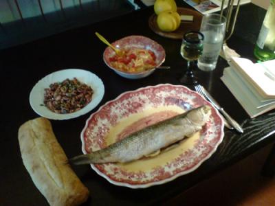 Für morgen ist genug übrigegeblieben: eine halbe Meeräsche, die ich dann kalt verputzen werde, während ich dem Tintenfischsalat auf Handwärme einheizen will; über Nacht mußte beides, weil es so schwül ist, in den Kühlschrank: an sich ein Verbrechen.