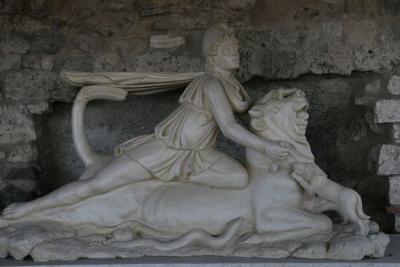 Da fing’s an, nein unterwegs schon [eigentlich sollte ein Satellitenfoto erscheinen, tut es aber nicht; ich laß aber den Link, der dann doch ein Foto zeigt, aber nicht in einem neuen Fenster (ich muß wohl den zuvor am Anfang stehenden Link zu Google Maps rausnehmen, er scheint den Zähler zu stören: da steht nach einer Stunde immer noch „0 mal gelesen“ : also bei google maps „Chiarone Beach“ eingeben)]. Sie saß auf einer Bank an der Straße mit Kosmetikspiegel vorm Gesicht und wartete schon auf mich, da in Tuscania. Ihr Auto müsse repariert werden, ob wir mit meinem fahren könnten. Gentilezza. Und dann die „Schuldgefühle“ beschwichtigen. Völlig verschwitzt war ich, als wir endlich am Strand waren und ich mich der am Körper klebenden Klamotten entledigt hatte. Einfach sofort geradeaus geschwommen bis zur Sandbank weiter vorn, wo man bis zum Oberschenkel im Wasser stehen konnte. Leider dann die weißen Striemen vom Schweiß im Polohemd und nichts zum Wechseln. Gut, ihr machte es nichts aus, also fing ich selbst an, bald nicht mehr dran zu denken, schon beim Aperitif nicht, kurz bevor wir nach Vulci weiter mußten zur „nächtlichen“ durch die Ausgrabungen. Also nur die wie immer dazu gereichten Chips und Erdnüsse als Abendbrot. Weil keine Zeit mehr war. Und in Vulci war’s sowieso dunkel und alle Augen mußten eher auf den Weg achten mit dem römischen Holperpflaster. Mit Taschenlampe natürlich. Bin zwar schon vor vielen Jahren dort gewesen, aber das Stadttor, das jetzt zu sehen ist mit dem tatsächlich etruskischen Fundamenten wurde erst vor drei Jahren freigelegt. Die Römer haben die Stadt eben einfach geschleift und sich ihre eigene Stadt darüber gebaut. Wenig nur ausgebraben bisher. Eine Domus beispielsweise mit komplettem Keller: Kryptoporticus mit konstanter Temperatur von 15°C, sommers wie winters. Das Mithräum mit der durch den Kopf des Mithras ergänzten Kopie der Original-Gruppe. Der Führer deutete die dahinter steckende Astrologie an, und ich mußte an den Kalender oben denken mit den Angaben der Auf- und Untergänge der Sternbilder, die besonders aus Columellas Werk über die Landwirtschaft, denn der Schwans des Stiers enden in einem Bündel Ähren. Kann hier nur auf den „Golden Zweig“ von Frazer verweisen. Und meinetwegen auch auf die Sequenz in Pasolinis „Medea“, die auf die Lehren des Zentauren folgen. Dort ist dann der Stier ein Mensch, dem das Genick gebrochen wird.