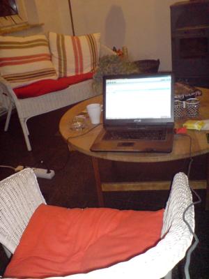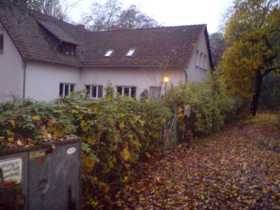 Endlich waren wir da. „Das ist es!“ Aber ein Schild NATURFREUNDEHAUS stand nicht dran, obwohl wir allezeit nach einem Ausschau gehalten hatten. Egal, die Veranstalterin war sich sicher. Fand aber nun den Schlüssel nicht. Am angeblich dafür vorgesehenen Ort war Leere. Unter den Füßen dichter Laubmatsch, nahebei rauschte der Autobahnzubringer. Versuche zu telefonieren, niemand nahm ab, aufs Klingeln an der Haustür reagierte eh keiner; weitere Telefonversuche, nun kackte der Veranstalterin Mobilchen ab. Nahmen wir halt meines. Endlich meldete sich wer, ich ging derweil im Garten auf und ab, lachte, überlegte, ob Svantje anrufen und fragen, ob sie vielleicht einen Couchplatz habe… rief شجرة an, um sie an dem Abenteuerchen teilhaben zu lassen, kurz: war sehr vergnügt. Ich mag sowas halt. Besser als jedes Luxushotel. Na gut, obersten Luxus nehm ich aus, Marmorbadewannen für drei und so… aber sowas kriegt man nur beim Fernsehn. Da man das bei Kulturbüros n i c h t kriegt, ist ein Naturfreundehaus die absolut ideale Alternative für Typen wie mich.