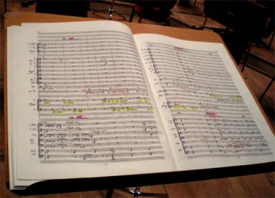 „Kann ich bitte mal die Hörner haben? 396… wer hat da das cis….? Gegenreaktion, zu mir herunter nicht zu verstehen. Zag verstand aber: „So klingt’s auch… ja, auch das Xylophon ist mir etwas zu spät. Bitte jetzt tutti 394…“