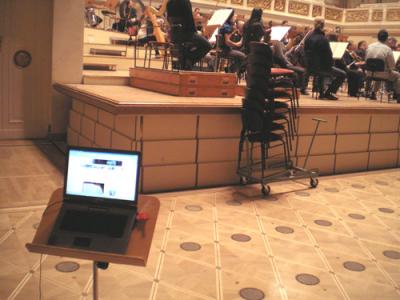 Die Probe beginnt pünktlich um halb zehn, ich schaff’s grad so, mein Zeug aufzubauen: zuerst den DR2, der sich nunmehr als vortrefflich und flexibel erweist, dann den Laptop. Es gibt keine Tische… nun also.