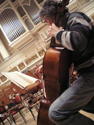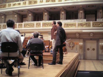 Vor der Tür mit einigen Musikern gesprochen. „Im Moment, von wegen Seele, machen wir reine Büroarbeit.“ „Büroarbeit?“ „Na guck Dir die Noten an…“ Gemeint sind die Noten für die einzelnen Stimmen. „Mein Blatt stammt von 1936, steht da drauf.“ Oft stimmen diese Auszüge nicht, „wir müssen die völlig durchkorrigieren.“ „Sie übertragen dann aus der Partitur in die Einzelstimme nach?“ „Ja. Das ist ein Wahnsinnsaufwand. Bevor wir da überhaupt dazu kommen, daß wir Seele spielen können, wie du sagst, ja, da ist die meiste Zeit nur mit diesem unnötigenn Zeug draufgegangen.“ Und dann bei einer Musik, die eben auch Berufsmusikern durchaus nicht grundsätzlich vertraut ist, gegen die es auch inneren Widerstand gibt, selbst bei Neugier. „Die Universal Edition ist bekannt für sowas… als gäbe es insgesamt immer nur ein Exemplar, na, vielleicht zweie… aber ich muß rein, es ist furchtbar kalt.“ Stimmt, zehn Grad minus, schätze ich und rauche auf und folge.