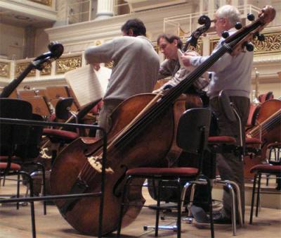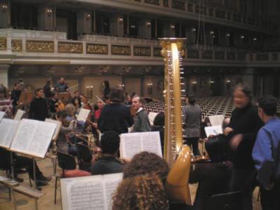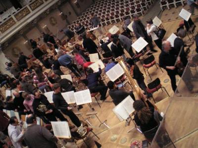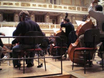 Ich bin ein wenig zu spät zur Probe gekommen, weil ich mich am Schreibtisch an der Tondatei festgefressen hatte, auf der Karsten Wiegand seine Ansprache ans Orchester hält. Die Aufnahme ist sehr verhallt, hat auch ein störendes Hintergrundrauschen; man versteht den Mann deshalb nur schlecht… ah, gerade eine Mißstimmung von Dirigent zu Orchestermitgliedern, die nichts zu tun hatten und nicht aufmerksam gewesen seien… ich kann’s nicht beurteilen. Aber kurz liegt Eis im Saal. Schade. – Also Wiegands Aufnahme: habe verschiedene Filter drüberlaufen lassen, auf Mono hinüberkopiert, sie wurde besser…. aber dann rannte mir die Zeit weg. Jetzt müssen Sie sich halt noch etwas gedulden. Ich krieg es aber sicher hin.