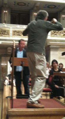 „Mann, der geht richtig rein da“: sagt Zag. Das Orchester applaudiert. „Wir machen das noch mal Stück für Stück. Von Beginn. Es beginnt sehr leise. Bitte schön zart machen.“ „Soll ich wieder ins Orchester?“ Von hinten: „“Wäre besser, mal andersrum, dann können wir das hören.“ Das Pult wird gedreht. „Acht Takte vor 79, vier Viertel -:“ – „Bitte nochmal, nicht so spät -:“ – „Sehr schön!“ – „Herr Gänsefuß, Frau Gänsekraut“ Ja, jetzt ist es verständlich. Das Orchester sackt weg. Kurze Besprechung Zag/Samel, neue Aufnahme: „“Herr Gänsefuß, Frau Gänsekraut“ — „Gut, bitte alle, 80, Crescendo, dann bitte wieder zurück. Machen wir drei vor 80.“ – „Ich weiß, daß st wirklich alles sehr schwer für Sie, aber… was jetzt einfach zu sehr dominiert sind die langen Töne in den Hölzern… da, wo alla breve steht, da immer etwas zurück. Drei vor 80 -:“