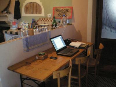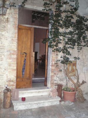 mitten im Centro storico, fast ganz oben auf dem Berg, immer wieder die Blicke, wohltuende Blicke in Verschachteltes, Bröckelndes, edelste Holztüren plötzlich, improvisiert Wunderschönes, hier dann die g a n z weiten Blicke über die Täler, an der mura meghalitico hinab zum Fluß, den scharfe Felshänge säumen, und diese Küche, Herd, schwarzelfenbein gekachelte Arbeitsecke mit Schneidebrett, alten Töpfen, das Öl in einer schweren Zweiliterflasche stammt aus der Gegend, ist süß und beißt, wie es muß.