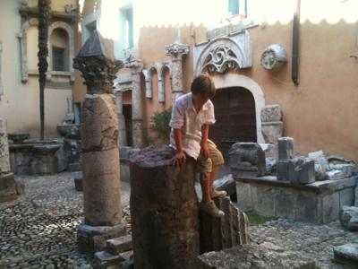 als es bei Eigner und I. das Abschiedsessen gab, im Centro Storico, mit weiterneuen italienischen Freunden durch die mittelalterlich verwinkelten Gassen, ließ sich ihm neue Regeln eines Versteckspielens erklären undsoweiter, mochte dann gar nicht mehr weg – ebenso wenig, wie, als wir am Montag nach Rom fuhren.