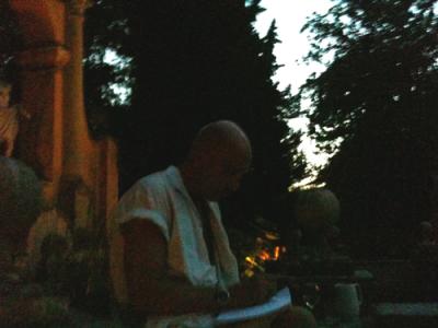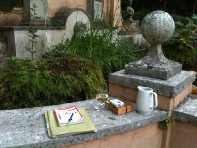 Freundlichste Aufnahme dort. Wir saßen am Brunnen, rochen die würzige Pinienrinde, lange saß ich auch noch allein, da war der Bub schon schlafen gegangen; wir hatten über das Kinderbuch gesprochen, sammeln Ideen, schreiben sie auf, aber richtig voran geht das alles nicht: eben:: es fließt so dahin.
