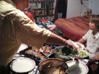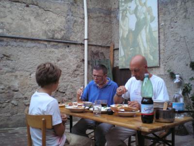 als es bei Eigner und I. das Abschiedsessen gab, im Centro Storico, mit weiterneuen italienischen Freunden durch die mittelalterlich verwinkelten Gassen, ließ sich ihm neue Regeln eines Versteckspielens erklären undsoweiter, mochte dann gar nicht mehr weg – ebenso wenig, wie, als wir am Montag nach Rom fuhren.