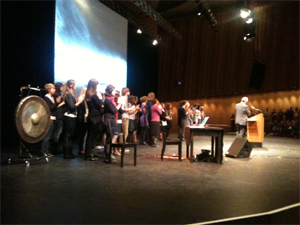 Die erste Begrüßung sprach der Hausherr der viel zu unterschätzten, doch großartigen Örtlichkeit. Er ging sofort, und scharf, zur politischen Sache, indem er aus einem Roman des chinesischen Widerstands-Dichters Liao Yiwu zitierte, der anwesend war nach großen Hindernissen. So jemand gehöre hier hin: ins Haus der Kulturen der Welt. Dafür sei es geschaffen. Ganz recht, nur daß sich nunmehr ein hübscher Dissenz der formulierten Begehren entwickelte, nämlich in Joachim Sartorius’, des Chefs der Berliner Festspiele, Rede. An jene nämlich ist das ilb mehr oder minder locker angegliedert, nur daß das Haus der Festspiele derzeit in Renovierung befindlich. Also pochte Sartorius darauf, das ilb habe nächsten Jahres selbstverständlich wieder bei ihm zu sein. Freilich war dies, er ist Berufsdiplomat, zumindest gewesen, aber eigentlich ist er’s noch immer… freilich in freundschaftlichem Ton ward’s vorgetragen und unter noch freundschaftlicherer Versicherung der gegenseitigen Freundschaft. Lächelnd saß Ulrich Schreiber vorn in der Reihe, der Erfinder dieses Festivals, das er gegen harte Widerstände, die man im gegenseitigen Einvernehmen heut freundschaftlich vergißt, sprichwörtlich aus dem Berliner Kulturfilz gestampft und innert der letzten zehn Jahre zu internationaler Bedeutung geführt hat. Doch das kleine Hickhack des „du gehörst mir”s einmal beiseite, bestach Sartorius’ Rede durch ihre Eleganz; er ist halt ebenfalls Dichter, und zwar einer, der zur Lyrik das Parkett der geschliffenen Prosa beherrscht. Das macht dann schon Freude, zudem, weil zu der klaren poetischen Diktion das Timbre einer angenehmen Stimme gehört. Auch weil es es versteht, zugleich ein wenig Politik zu treiben: Man möge doch bitte – dies an den Vertreter des Auswärtigen Amtes gerichtet – jenes Haus in Instanbul endlich den Künstlern, die dort arbeiten wollten und könnten, zur Verfügung stellen. Die Idee ist um so nachhaltiger zu unterstützen, als die Türkei nach Europa will und sich über ihre Brücke das Abendland wieder runden könnte.