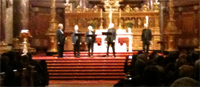 Da strömen die Gläubigen h i n, nahezu jeden Alters wie gestern abend und jeder Schicht, um den Klang-Erlöser zu hören, Intellektuelle wie Angestellte, Studenten wie ihre Räte; das Konzert war derart überbucht, daß es im Februar am selben Ort wiederholt werden wird: so langweilig war es. „Haben Sie nicht ein Konzert mit Hilliard allein?”