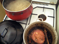 Habe den Einkauf vorgezogen und das Sauerkraut bereits aufgesetzt, das der Junge so sehr gerne ißt, sowie vor allem die Kasslerschulter angebraten, was, weil ich hier nach wie vor meiner Großmutter folge, viele Zwiebeln, viel Rühren und viel Zeit braucht: für die Sauce nämlich, die ich dann allerdings leicht anders bereite. Mit Spuren von Zimt, etwas Rosmarin, die beide schon zur Einbrenne kommen. Beide Tröpfe bruzzelt jetzt vor sich hin; beim Sauerkraut wird kurz vor dem Abschluß eine halbe Flasche Wein zugekippt; der Champagner war mir zu teuer.