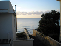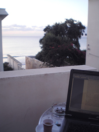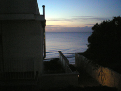 Vor mir das westliche Meer. Die Brandung geht, ging die ganze Nacht. In einem Zimmer hinter mir schlafen die Freunde, im dahinter nächsten schläft mein Sohn. Ich sitze auf einer erhöhten Terrasse, deren Strombuchsen ohne Strom sind, so daß ich ‚auf Akku’ schreibe. Da es dunkel ist, bewährt sich nun die kleine Einstecklampe für den USB-Anschluß. In der Ferne ahne ich bereits einen Streif der Aurora, die an diesem Ort über das Meer in meinen Blick hineingehen wird. Ein beidseits ummauerter, nur schmaler und unebner Gang, dessen letzte Stufen wie ein kleiner Marmorbruch sind, führt an den Strand, der hier aus feinem Sand besteht, aber keine zwanzig Meter breit ist. Bis dicht an ihn heran die kleinen Kästen der Häuser, die alle drei Stockwerke und auf dem Dach je ihrerseits Terrassen haben. Über mir stehen noch die Sterne klar. Aber der Lichtstreif im Westen, zunehmend, übertönt sie, dessen Horizont direkt überm Wasser fast noch schwarz ist, aber um eine Spur rötlich wird, darüber bereits ein helleres Blau.
