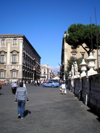Sie ist aber auch nun fort, es war eine kurze Begegnung, zwar, aber dunkel, ja fiebrig. Sehr zerschlagen war ich erwacht, hatte verschlafen gestern, so daß es keinen Sinn gehabt hätte, meinen eigentlichen Plan umzusetzen: der mich den Frühzug nehmen lassen und ans Frühstück in Giardini setzen wollte. Das wäre nicht mehr zu schaffen gewesen. Also eilte ich, nachdem ich Ihnen meinen gestrigen Brief in einem Internet-Café eingestellt hatte, zum Bahnhof und löste mein Ticket nach Syrakus. Wo ich nun, logischerweise, früher als die Freunde ankam, die ich während der Fahrt informierte; das ging ja mit meinem Ifönchen sehr gut. Kurzes fernmüdliches Aufstöhnen in Giardini Naxos: „Aber dann müssen wir ja deinen reisigen Rucksack zusammenpacken und vor allem runter ins Auto schleppen. Außerdem… heute nacht: C. hat einen Schmerzanfall, Zahnschmerz, der Weisheitszahn… Wir bräuchten dich, um simultan zu übersetzen.” „Gut”, sagte ich, „dann werde ich in Syrakus übers Netz nach einem deutschsprachigen Zahnarzt schauen. Geht es jetzt mit dem Schmerz?” „Sie hat Tabletten genommen.” „Ich finde ganz bestimmt ein Internetcafé in der Nähe des Bahnhofs. Wenn ihr ankommt, fahren wir gleich zum Zahnarzt weiter. Seid unbesorgt, ich kümmer mich drum.”