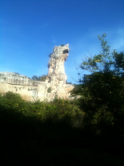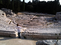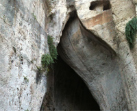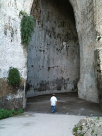 Wir fuhren in die archäologische Zone, ich schrieb schon von ihr. Ins Ohr des Dionisios wollte ich unbedingt, für meinen Jungen: wo man ganz tief im Berg flüstern könne, welcher Sklave auch immer, der über den Tyrannen raunte…: draußen am Eingang, der einem riesigen Faunsohr ähnelt, sei das zu hören gewesen und von den LauschernAmOhr dem Tyrannen schnell hinterbracht, der flüsternde Sklave ausgesondert und zu Tode gebracht. Aber der „Effekt” ging über die Menge von Leuten verloren, die in der hohen, tiefen Höhle waren und