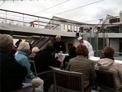 Die Glasenglocke erklingt. Sie wird hier zu Mittag traditionell noch geschlagen. Überall sitzen Leute und lesen, und in der Captain’s Bar wird Bingo gespielt. Bisweilen kommt Sonne durch die Wolken, aber auch bedeckt gleißt sie aufs Biskayische Meer. See-Tage sind Meditationen.