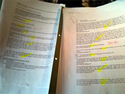 Da das Skript mit all den gelben Häkchen, den roten Auszeichnungen der Studioaufnahmen sowie den schwarzen Zeichen der bereits vorher aufgenommenen Sammelstimmen allmählich unübersichtlich geworden ist, brach ich die Aufnahmen für heute ab; eventuell werde ich aber heute spätabends noch einmal hinausgehen und vor ganz anderen akustischen Hintergründen weitere, vielleicht die letzten nötigen Stimmen sammeln – oder fangen, denn auch das kam vor.