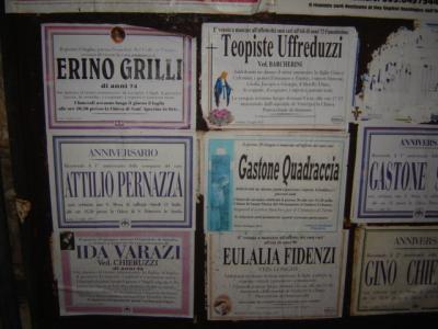 Alle beiden Beine per pedes (aber nur in der Oberstadt, das wenige zu be-, und die Katze der Neffen zu versorgen, denn die famigliola macht Urlaub am Meer, ansonsten die beiden Hauptverkehrsgassen mit dem wieder mal Taubenscheiße transportierenden Auto (auf der Kühlerhaube (und die Greisin singt im Bad gegenüber dem Fenster, während ich schreibe)). Am 21. Juli – heißt es in einer Pressemitteilung – wird das Personal der außerstädtischen Busdienste streiken, am 22. protestiert das Personal der städtischen Busse, U-Bahnen und Straßenbahnen. Das Personal der Eisenbahn und der daran angeschlossenen Tätigkeiten wird vom 21. Juli 21 Uhr bis zum 22. Juli um dieselbe Zeit in den Streik treten. Dies für die Anreisenden. Was mir aber durch den Kopf und mir vorhin keine Ruhe ließ: Teopiste. Teopiste ist gestorben. Erst als ich vorhin hinunter ging mit dem Fotoapparat, erfuhr ich durch das „amatissima“, daß ein Frauenname gemeint ist. Aber bevor ich’s fotografieren konnte, kamen F. (der heute wieder in seiner Tischlerei unter mir zu arbeiten begonnen hat – nach dem Urlaub in Apulien) und C. über den Platz. Ob ich am 27. August etwas vorhätte und überhaupt da sei, da sei ein großes Fest auf dem Platz. Was für ein Fest das sei? „Wir heiraten.“ Dabei dachte ich, sie wären es bei den gemeinsamen Kindern schon längst. Also Teopiste. Die gottgläubige Theopista, Märtyrerin mit Mann und Kindern im „glüenden Ochsen“, nicht ohne von oben verfügter Leibeserhaltung und -verschönerung. Nach dem Fotografieren näherte sich Meroslava von hinten, die auch am Platz wohnt. Ihren Mann habe ich seit Monaten nicht gesehen, und die Frage nach dem Wo scheint sie nur flüchtig und ungern mit einem „Arbeit“ zu beantworten (MM mauschelte einst von irgendwelchen krummen Geschichten in der Ukraine: ein Hörensagen, das ihm selbst auch nie jemand bestätigt hat). Ich frage auch gar nicht mehr. Sie wolle zu Silvia, sagte schon „ciao“, begleitete sie dann aber doch noch bis zur Ecke, nur daß sie unvermittelt umkehrte. Denn bei Silvia brannte kein Licht. Deren Mann liegt im Krankenhaus, virale Hirnhautentzündung. Vielleicht ließ mich Teopiste an irgendwelche Pisten denken oder an irgendein Zerstampfen und Zertreten via „pestare“, an meinetwegen ausgetretene Wege.