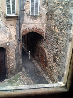 Es regnete nachts. Ein Mysterium, denn die Wäsche, die ich gestern gewaschen und aufgehängt, war trockengeblieben; dabei stand auf der Metallplatte das Wasser, die den Brunnen abdeckt. Und auch mein Arbeitstisch draußen war ganz naß. Dann pieselte es erneut. Aber jetzt kommt schon die Sonne wieder heraus. Ich will, wenn dies hier eingestellt ist, durch die mittelalterlichen Gassen hinab zum Wochenmarkt, und mein Bub, der will mit.